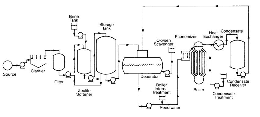 Như đã đề cập ở trên, các thành phần chính xác của hệ thống xử lý nước cấp lò hơi phụ thuộc vào chất lượng nước được lấy ra liên quan đến chất lượng nước bổ sung cần thiết cho lò hơi cụ thể (theo khuyến nghị của nhà sản xuất), nhưng nhìn chung, hệ thống xử lý nước cấp lò hơi cơ bản thường bao gồm một số loại: